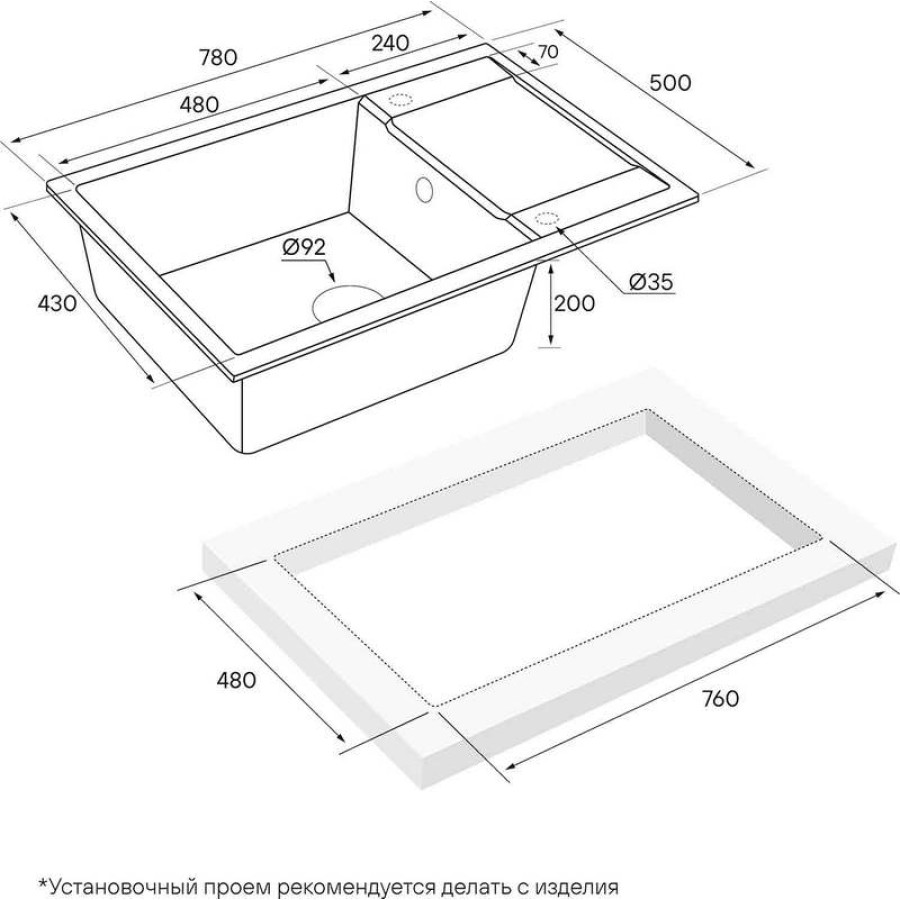 | Размер чаши43 x 48 x 20 см | Способ монтажаврезная на столешницу | Форма мойкипрямоугольная |