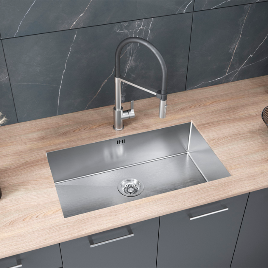 Кухонная мойка ТМ PAULMARK из нержавеющей стали, 3 вида монтажа: врезная на столешницу, врезная вровень со столешницей, врезная под столешницу. Изготовлена из аустенитной нержавеющей стали марки AISI 304, имеющей низкое содержание углерода. Нержавеющая сталь AISI 304 легирована 18% хрома и 8% никеля, что делает данную мойку не подверженной деформации и обеспечивает прекрасные эксплуатационные характеристики. Благодаря использованию стали AISI 304 мойка не подвержена деформации, выдерживает большой вес посуды, продуктов и измельчителя пищевых отходов, устойчива к термическим воздействиям, устойчива к образованию ржавчины, не задерживает загрязнения на поверхности, безопасна для здоровья и легка в уходе и чистке.