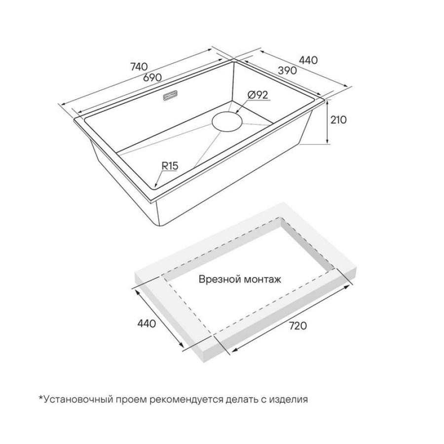| Размер для монтажного выреза44 x 72 см. (для врезного монтажа) | Размер чаши39 x 69 x 21 см | Способ монтажаврезная вровень со столешницей, врезная на столешницу, врезная под столешницу |