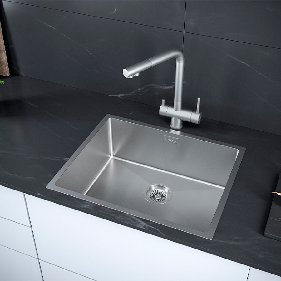 Кухонная мойка ТМ PAULMARK из нержавеющей стали, 3 вида монтажа: врезная на столешницу, врезная вровень со столешницей, врезная под столешницу. Изготовлена из аустенитной нержавеющей стали марки AISI 304, имеющей низкое содержание углерода. Нержавеющая сталь AISI 304 легирована 18% хрома и 8% никеля, что делает данную мойку не подверженной деформации и обеспечивает прекрасные эксплуатационные характеристики. Благодаря использованию стали AISI 304 мойка не подвержена деформации, выдерживает большой вес посуды, продуктов и измельчителя пищевых отходов, устойчива к термическим воздействиям, устойчива к образованию ржавчины, не задерживает загрязнения на поверхности, безопасна для здоровья и легка в уходе и чистке. В настоящее время идет корректировка размера чаши, длина чаши уменьшена на 1 см. В связи с этим рекомендуем выпил для подстольного монтажа делать только после получения изделия и замеров непосредственно с изделия!