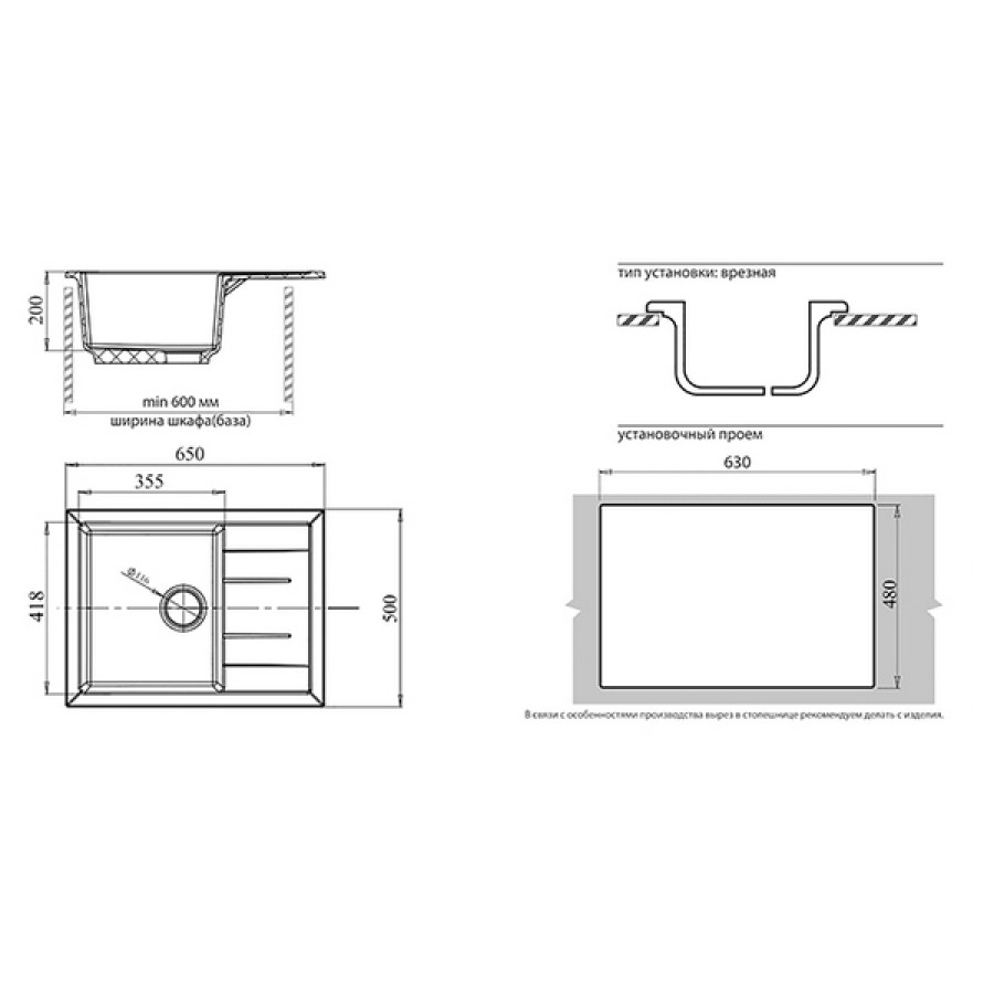 Технические характеристики Мойка кухонная GRANFEST GF - Q650L чаша слева черный (выставочный образец)