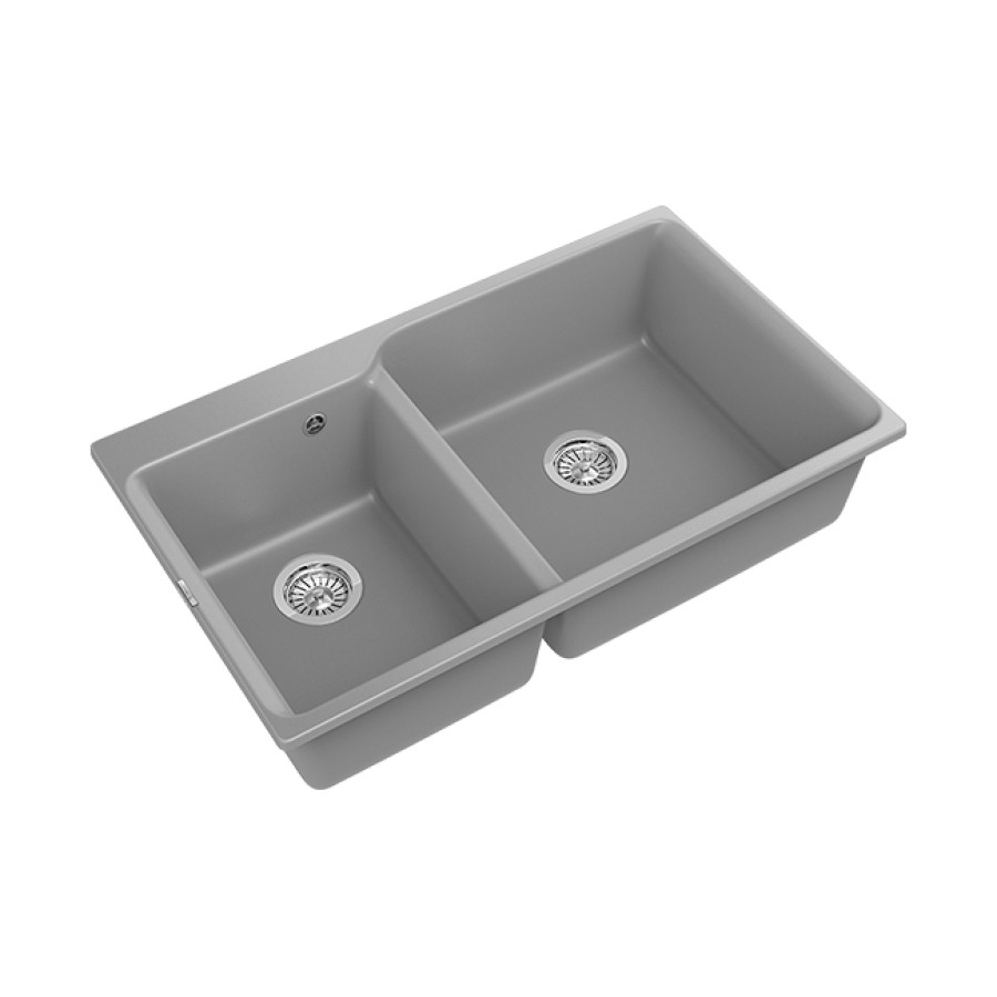 Кухонная мойка TM RIVELATO, врезная на столешницу, прямоугольная, полторы чаши, чаша справа.Исполнение: цвет: серый (цвет производителя: grigio metallizzato/серый металлик). Мойки ТМ RIVELATO чрезвычайно элегантны и придают естественный вид вашей кухне. Обработанный гранит отличается нежным блеском, он теплый на ощупь. Поверхность прекрасным образом текстурирована, но при этом не имеет пор, что обеспечивает ее высокие гигиенические свойства. Состоящий из 80% кварца и 20% чрезвычайно твердой акриловой смолы, износостойкий материал моек ТМ RIVELATO будет дарить вам свою красоту на протяжении многих лет эксплуатации, сохраняя первоначальный внешний вид и глубину цвета. Мойки из кварцевой крошки от RIVELATO обработаны специальным биоцидным составом на основе ионов серебра -это позволяет уменьшить рост бактерий и микробов на поверхности мойки до 99%. В то же время IT-GRANIT® остается устойчивым к ударам, царапинам, образованию пятен и обесцвечиванию, устойчив к уф-излучению и воздействию высоких температур вплоть до 280° С. Чтобы поверхность мойки из кварца выглядела как новая, достаточно просто протереть поверхность круговыми движениями смоченной в мыльном растворе нейлоновой щеткой и затем тщательно промыть поверхность проточной водой. При уходе за изделиями из кварца не рекомендуется использовать абразивные составы, порошки, отбеливающие растворы и средства для удаления засоров дренажных труб.